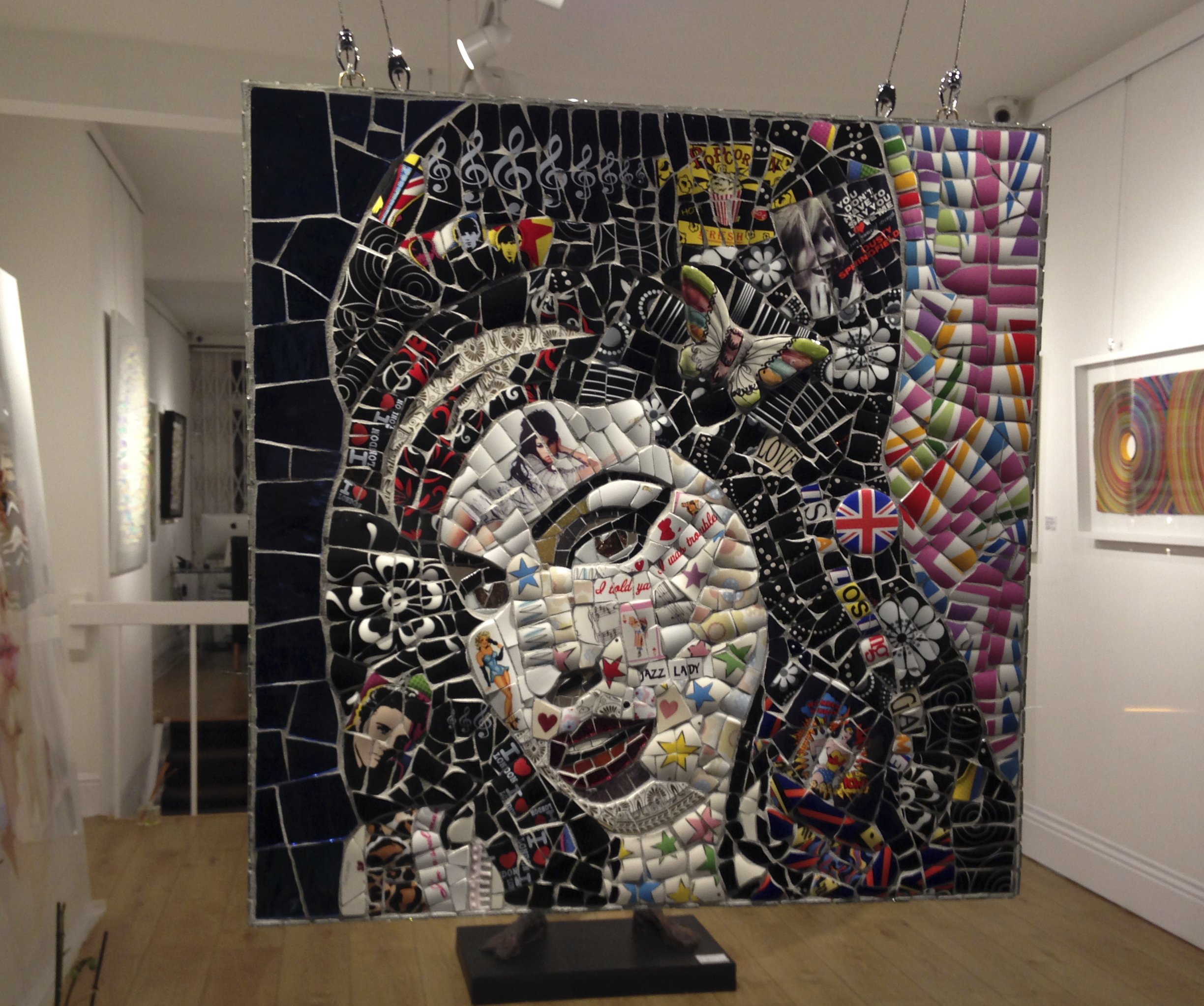 Mosaic by Susan Elliot at the Cube Gallery on Crawford Street. Her work, she says, “is like archiving the cupboards and mantelpieces of a Nation – it’s made out of kitchen tea time crockery, kitsch tourist mementos, novelty mugs, badges, coins, the everyday stuff of domestic living.”