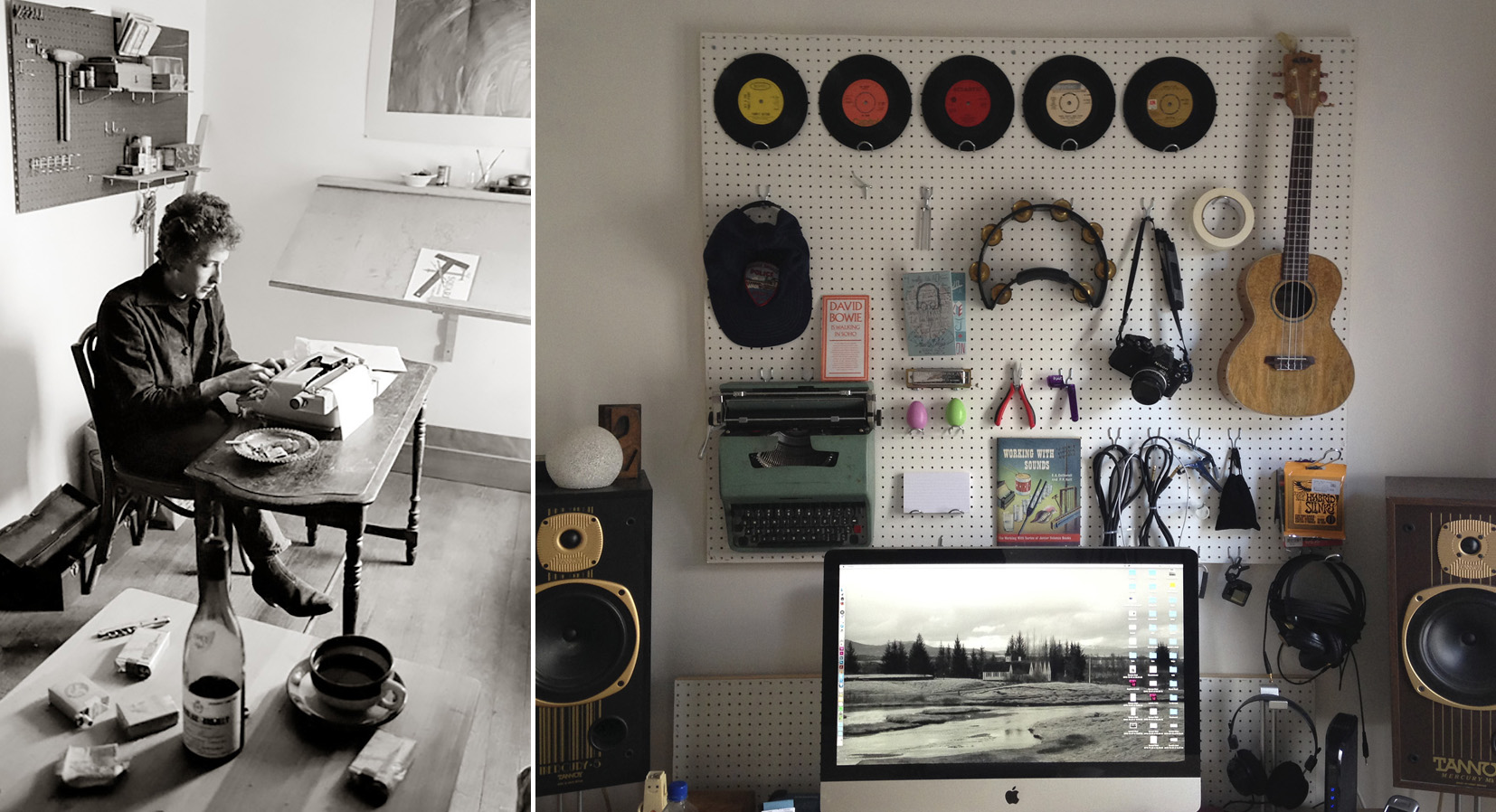 Years ago, Rolling Stone did a piece on Levon Helm’s studio, The Barn, and they were extremely taken with the full-size American flags that were hung from the tall double-height walls. They suggested that Levon could well turn his talents to interior design. Well, my current tip is inspired by Bernard Paturel’s Café Espresso in Woodstock. In a set of photos taken by Douglas Gilbert in 1964 for Look magazine – but rejected, as Dylan was deemed too scruffy – there are shots of Bob writing in the upstairs room. Behind him are tools hung on pegboard (perforated hardboard to the timber trade), and I became obsessed with finding some to put on the studio wall. Of course, it also has memories of record-listening booths in the early sixties, so seemed apposite. Thrilled to actually find some, this was the result. I am, obviously, available for all freelance interior design gigs…