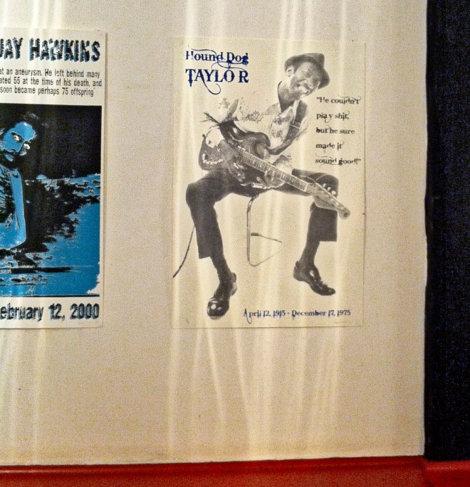 I’ve been listening to Hound Dog Taylor lately and who should I find on the walls of an artfully lo-fi restaurant but the man himself, complete with great quote: “He couldn’t play shit, but he sure made it sound good!” I should point out that these were his own words, prefaced with “When I die, they’ll say…”