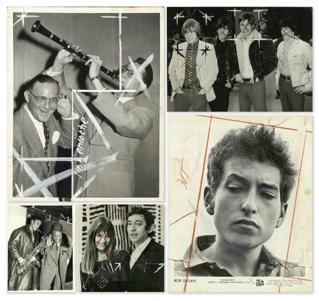 Bennie Goodman clowning with Steve Allen; The Stones in Paris (only Brian Jones escapes a wax pencil cross); Dylan press release shot for The Times They Are A Changin’; Jane Birkin with Serge Gainsbourg; Lionel Hampton clowning around with Elsie Smith; notice how Jazz musicians always seem forced to ‘clown around’…